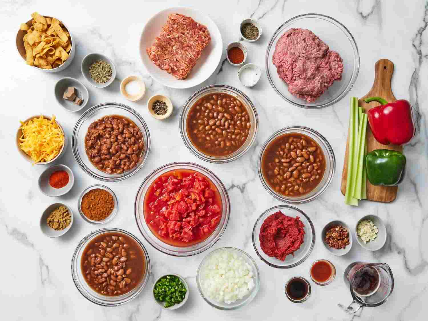 - Step 3:Pour in chili beans, spicy chili beans, diced tomatoes, and tomato paste. Add celery, onion, bell peppers, chile peppers, bacon bits, bouillon, beer, 1/4 cup chili powder, garlic, Worcestershire sauce, oregano, cumin, hot pepper sauce, basil, cayenne, paprika, sugar, 1 teaspoon salt, and 1 teaspoon black pepper. Stir to blend, then cover and simmer over low heat for at least 2 hours, stirring occasionally. Dotdash Meredith Food Studios