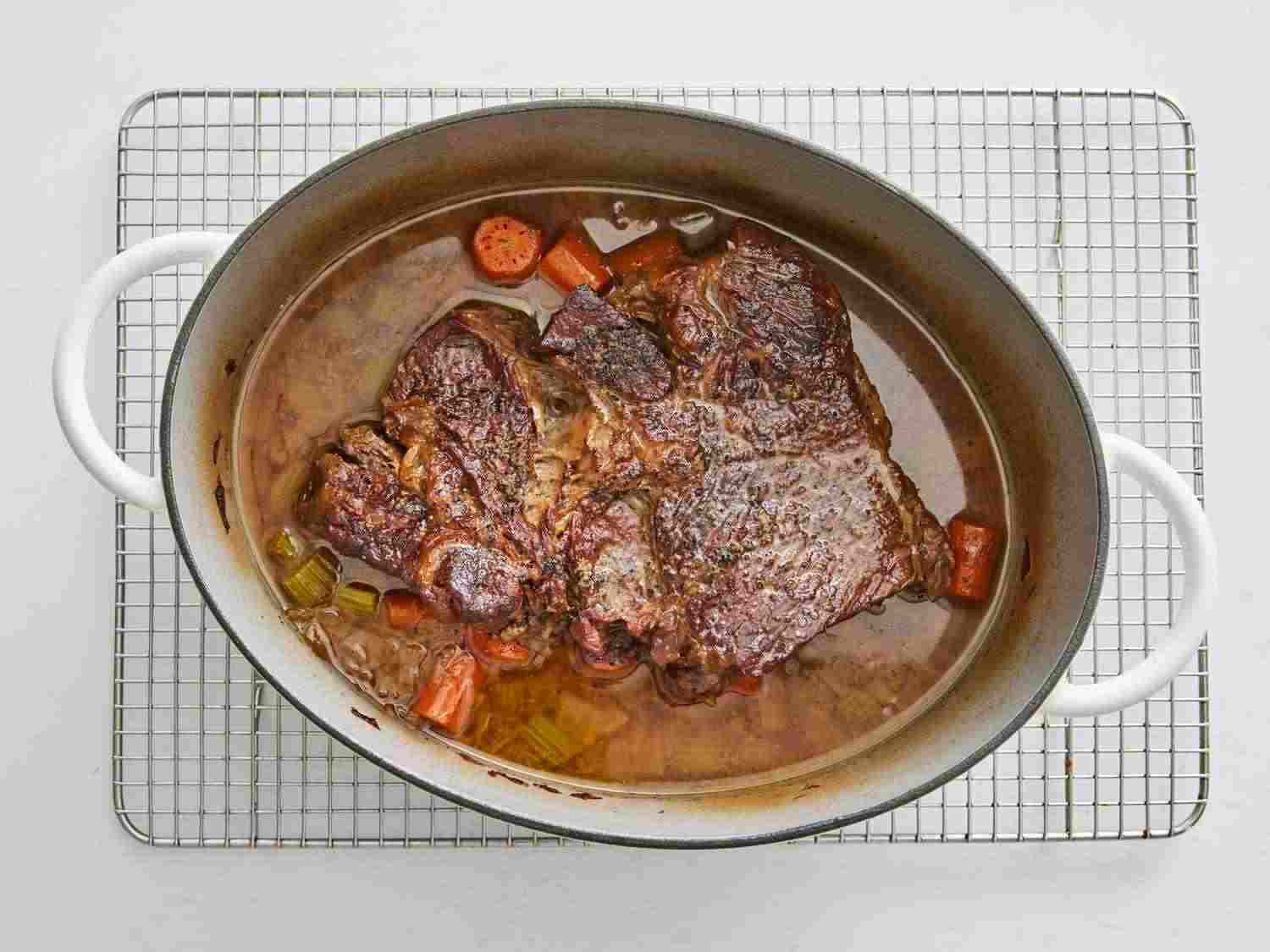 - Step 2:Heat vegetable oil into a large oven-safe pot over medium-high heat. Season chuck roast with salt and black pepper. Dotdash Meredith Food Studios