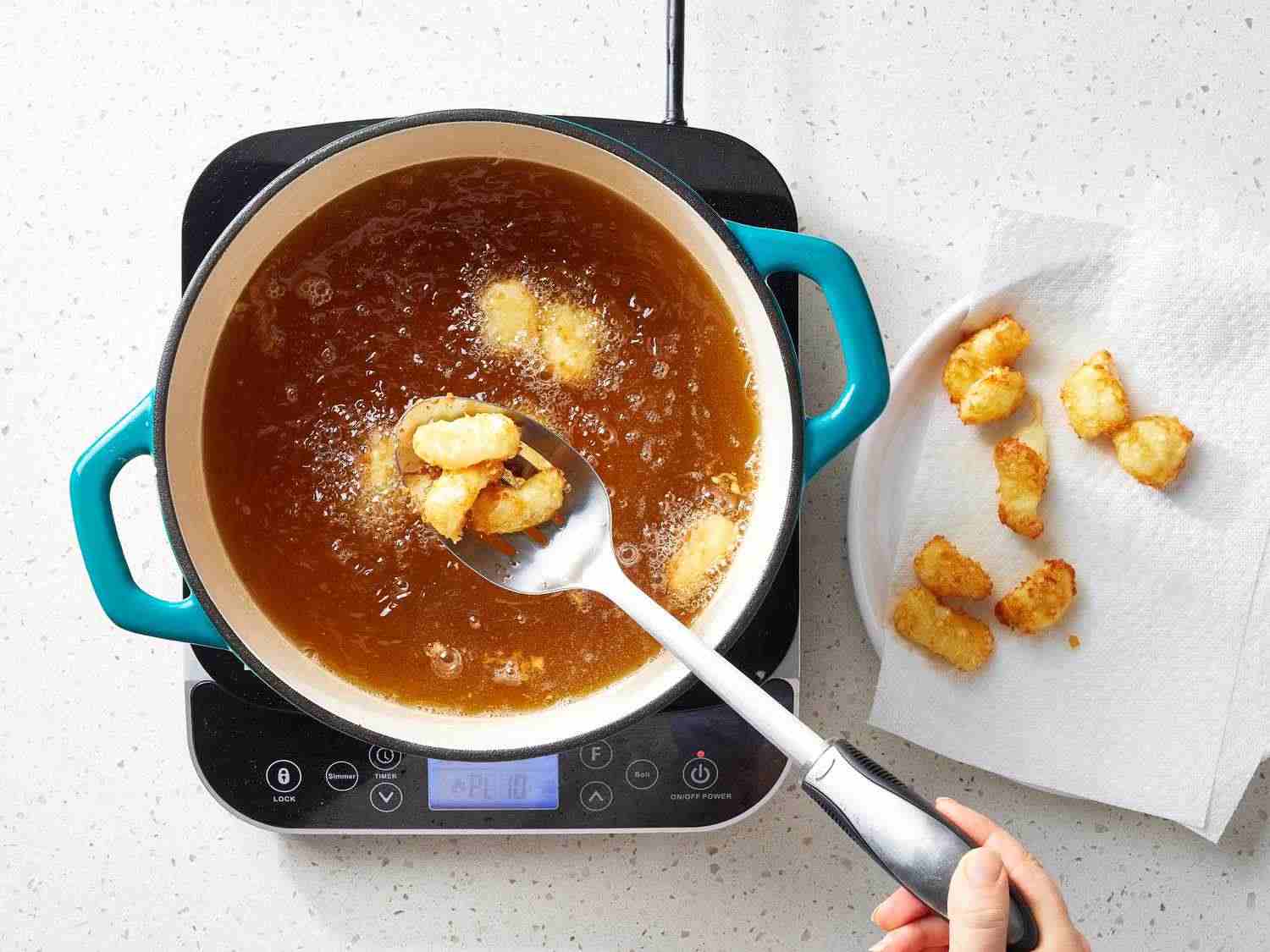 - Step 4:Shake the curds a time or two to remove excess batter. Dotdash Meredith Food Studios